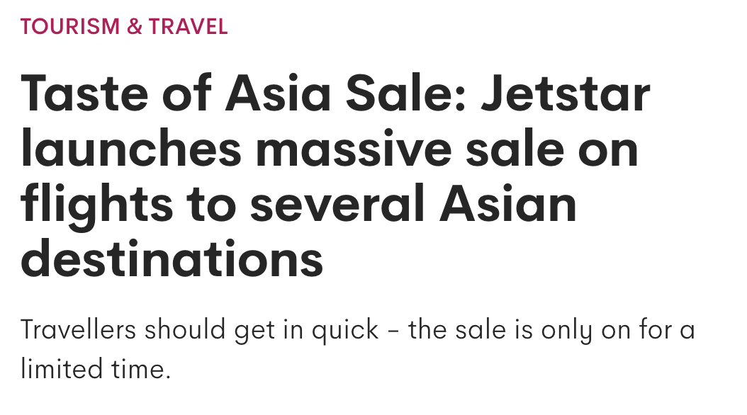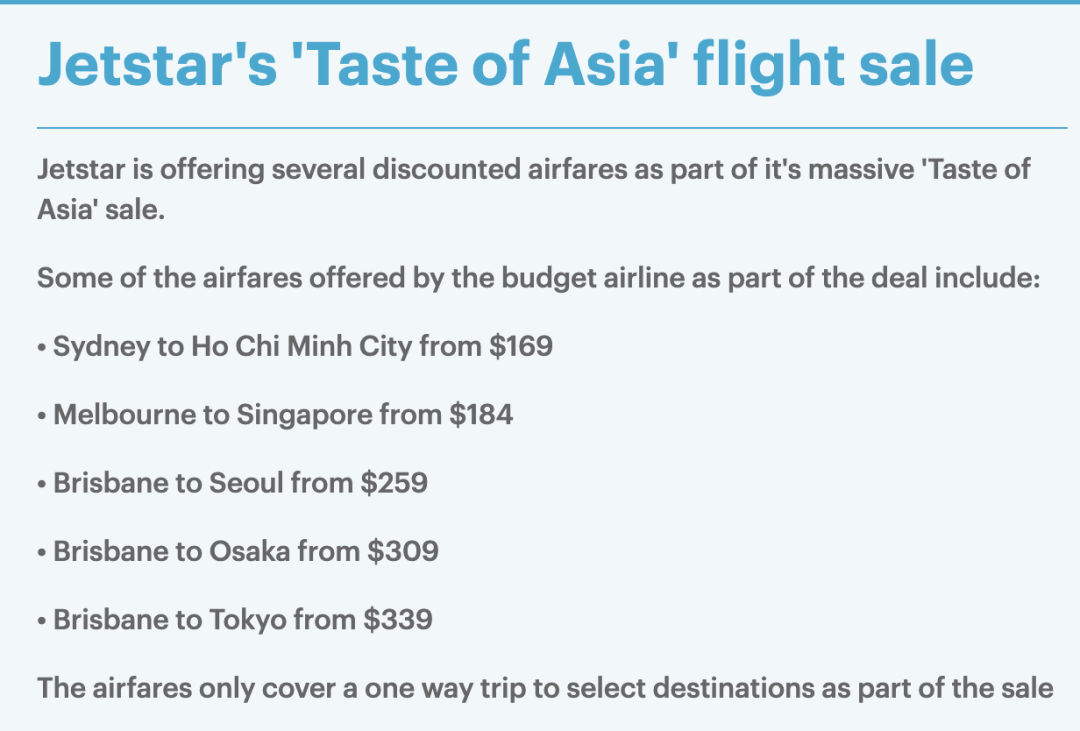 除了中澳迎来新航班,Jetstar在刚刚也推出了飞往多个亚洲目的地的大规模促销活动——Taste of Asia。