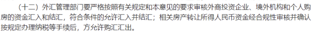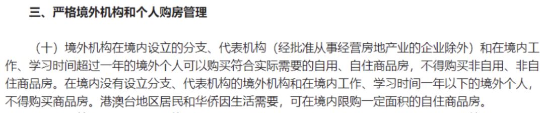 这份意见中,第三条规定显示,“严格境外机构和个人购房管理”,