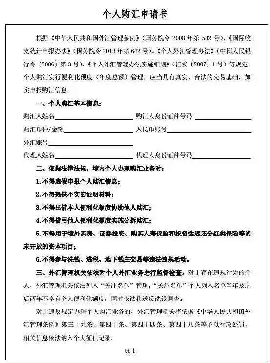 个人在国内办购买外汇时,需要填写一份全新的《个人购汇申请书》,