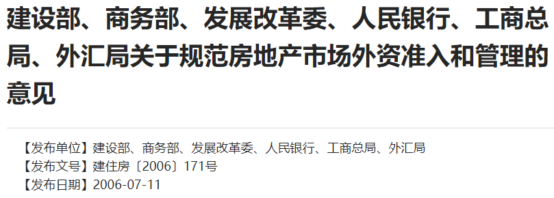 即在2006年7月11日发布的《关于规范房地产市场外资准入和管理的意见》。