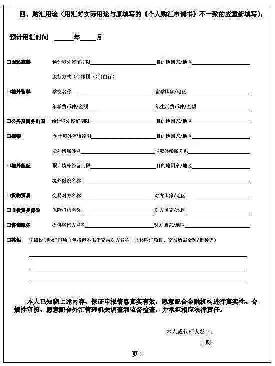 而在《个人购汇申请书》,要求购汇者清晰表明购买外汇的用途。