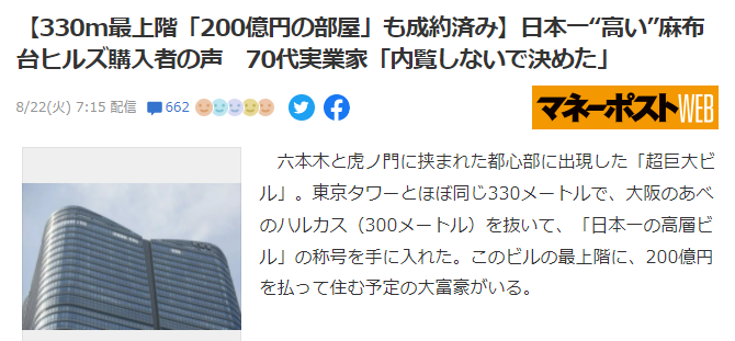 上周,日媒终于公布:原来早前以200亿日元(约合人民币9.8亿元)买下东京最贵公寓的神秘买家,是日本一位70岁的企业主。