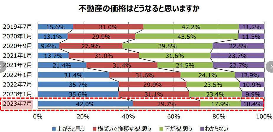 从野村不动产最近公布“关于购房意识的调查”中,也能看出,有超过42%日本民众认为,“不动产的价格还得继续上涨”,创下历史新高,而有29.7%的人认为,房价继续会维持在当前的高位走势,仅有不到18%的人,认为房价会下降,这和去年7月相比人数减少了近一半。