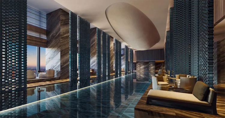 每间私宅都有专属电梯直达前廊,配备可俯瞰城市全景的25米长游泳池、1400平方米的水疗中心、酒吧、图书馆、茶室和私人厨师提供餐饮服务等等。