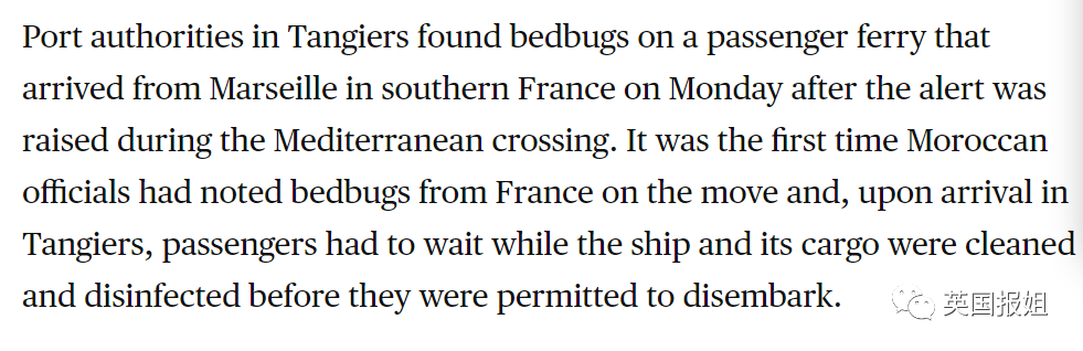 有些臭虫已经“跳槽”去了摩洛哥。摩洛哥港口工作人员称,他们在一艘从法国南部马赛抵达的客轮上发现了臭虫,乘客们在船只及其货物进行清洁和消毒后,才能获准下船。
