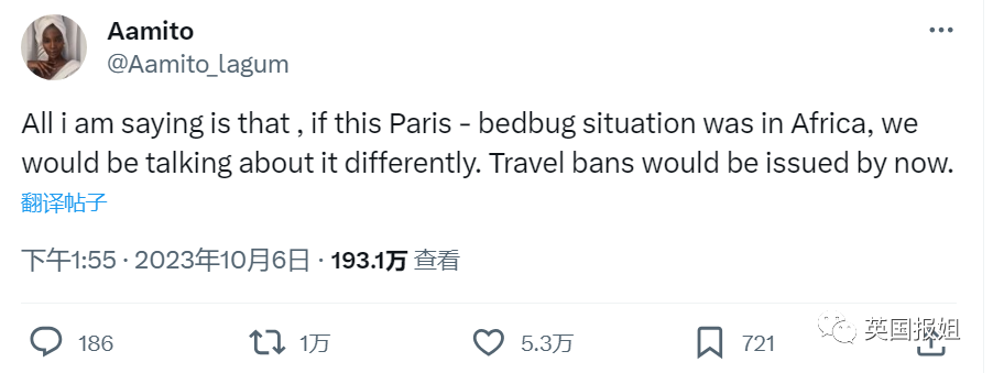 “如果这次臭虫爆发是在非洲的话,舆论不会是这样,欧美早就会实施各种旅游禁令了。”