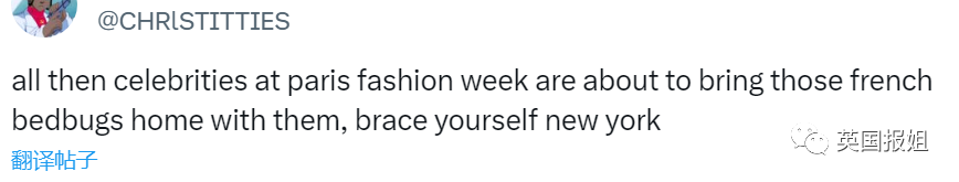 “参加巴黎时装周的所有名人都准备把法国臭虫带回国,纽约,颤抖吧!”