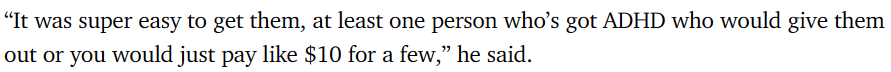 他说:“获得这些东西非常容易,身边至少会有一个患有多动症的人会分发它们,或者花$10就可以买一些。”
