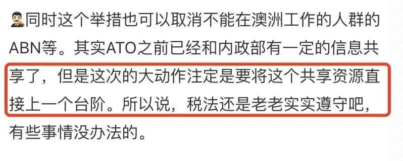 “其实ATO之前已经和内政部有一定的信息共享了,但是这次的大动作注定是要将这个共享资源直接上一个台阶。所以说,税法还是老老实实遵守吧,有些事情没办法的。”