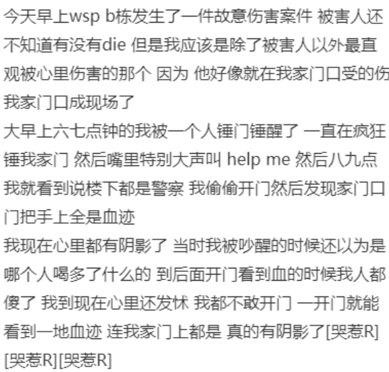 后来有消息称,这起事件起初是因为楼内居民和朋友之间口角引发,最终升级为一起暴力事件,导致大量流血事件。