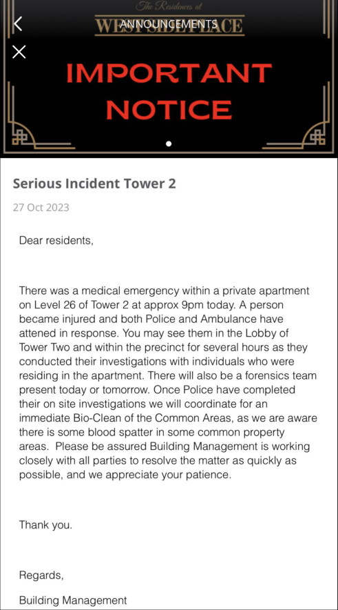 “晚上9点左右,2号楼26层的一间私人公寓内发生了紧急医疗事故。有一人受伤,警方和救护车都已到场处理。你可能会看到他们在2号楼的大厅和辖区内进行了几个小时调查,他们对住在公寓里的人进行了调查。今天或明天也会有一个法医小组到场。一旦警方完成现场调查,我们将立即协调对公共区域进行生物清洁,因为我们知道在一些公共区域有一些血液飞溅。请放心,大厦管理处正在与各方密切合作,尽快解决问题,我们感谢您的耐心。“