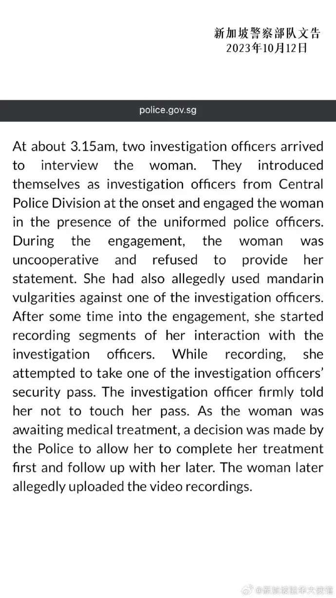 而新加坡警察部队在声明中表示,在10月10日凌晨接警后,两名调查人员赶到现场,在问询开始前自我介绍他们是中区警署的调查人员,