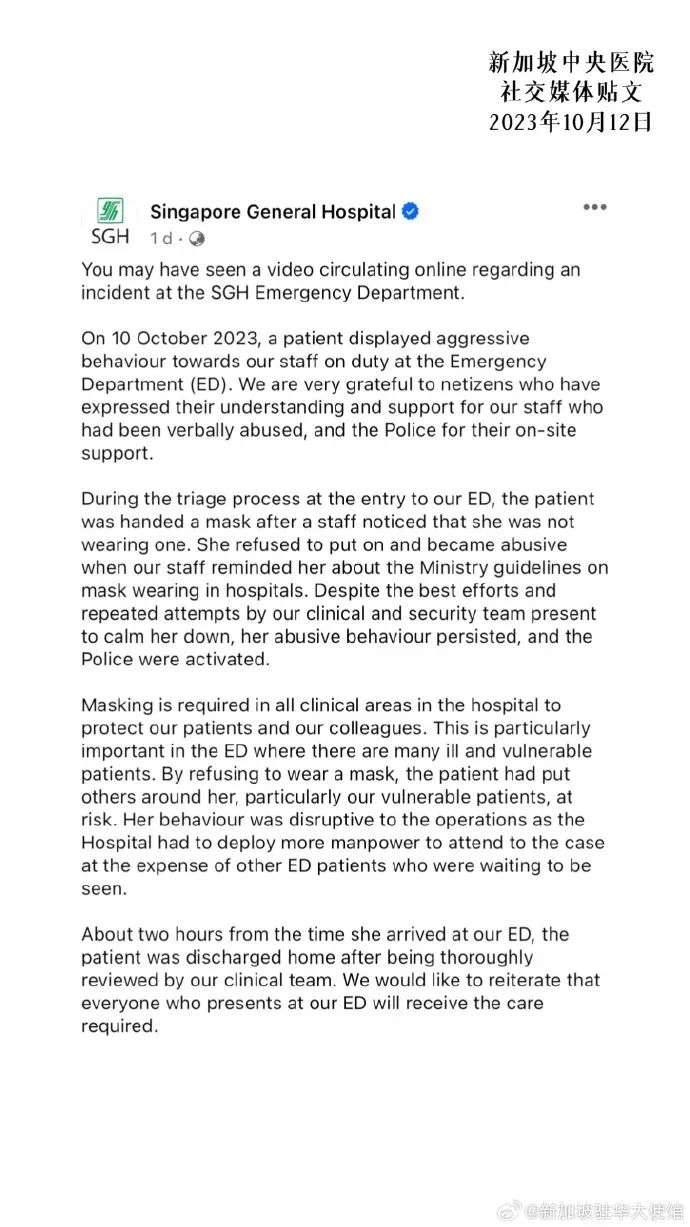 新加坡中央医院在声明中表示,这名女子在进入急诊室前没有戴口罩,于是医护人员给了她一个口罩,但她拒绝佩戴。