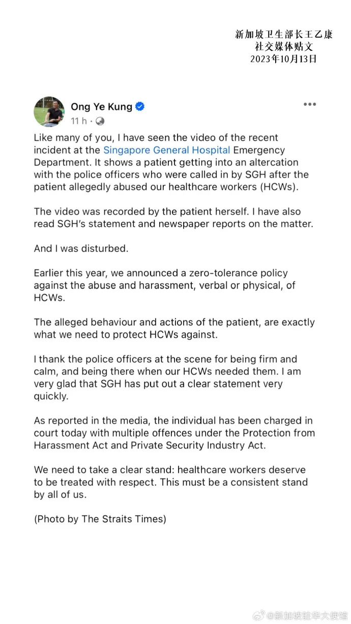 事后新加坡卫生部长也在社交媒体上发文表示:医护工作者应该被尊重,这需要我们所有人都坚持做到。