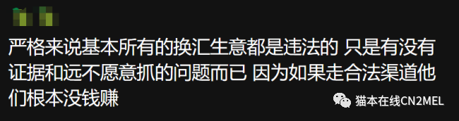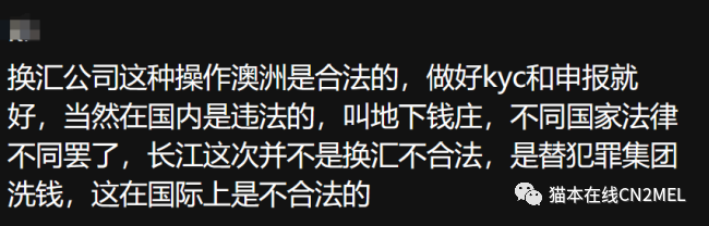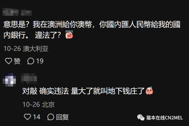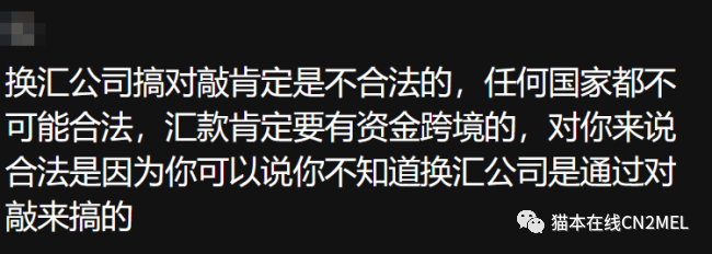澳洲可能是合法,但仅限于在发生在澳洲的部分。举个例子,我拿着澳币跑去换汇店说我要换外币(具体什么外币澳洲不会管),这个行为本身是合法的。但是,你接收的方式是国内的账户,这就违反了国内的法律。当然这实际上有漏洞,因为在国内我不会承认这笔钱是换汇,只是普通转账。所以这就给这些人民币外汇公司创造了赚钱契机。