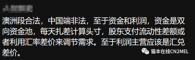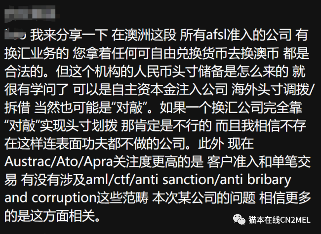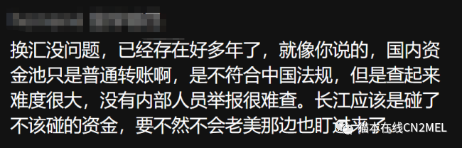 昨天发的观点引起了各位的激烈讨论。我解释一下长江换汇之前的“换汇”逻辑:假如A要澳币换RMB, B要RMB换澳币。那长江会让A 把澳币转给公司,然后公司把这笔澳币转给B。在国内,B会转给一个“工作人员”个人账户,然后这个个人再转给A。所以你就会发现,你所谓的换汇其实压根没有资金的跨境流动,根本没有所谓的换汇,只是通过长江这么一个中介,互相转了两笔钱而已。。。昨天有小伙伴说这个方法实际可行,不违法。。。好吧,今天AFP公布了此方法叫offsetting,也就是我们中文说的对敲,其实违法。(更正:offseting是被允许的,但发生在机构与机构之间)