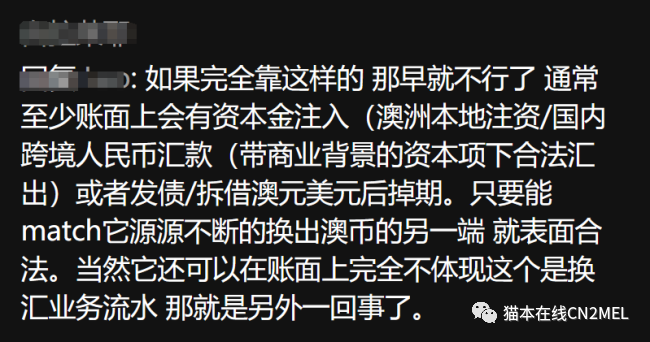 你看其实整个换汇过程其实没有换汇行为的发生,只是两个币种账户的一出一进而已。但我其实觉得这样换回还是在澳洲违法的,因为在国内换汇公司的付款方并不是相关公司,而是个人,你的账目看起来不就只进不出?当然也可以做成反向交易对冲了,但这不就要编虚假交易信息了么? 总之细思极恐。。。所以我感觉AFP只是揭开了冰山一角,随着调查的深入还会有更多的消息被挖掘出来。中国的银行每年每人合法可换5w美元,我想这对于大多数人都足够了。