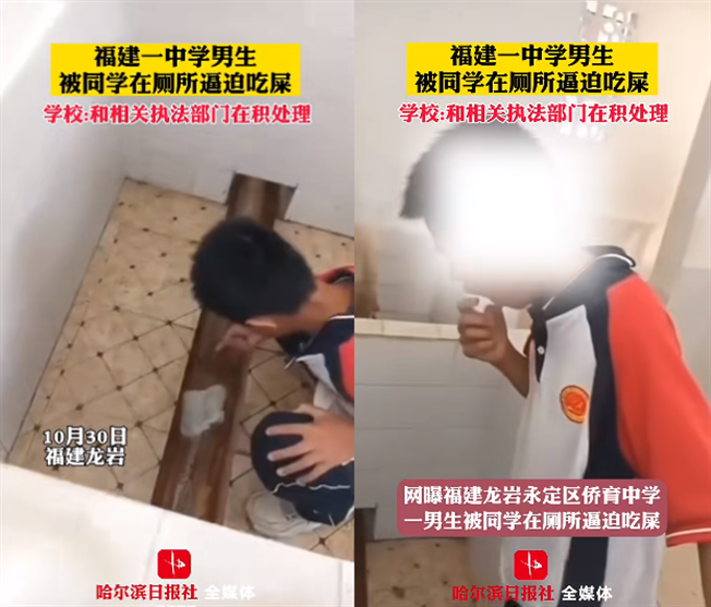 福建龙岩一所中学的厕所,一个男孩蹲在便坑前,被同龄人逼迫着,把手伸进坑里,蘸取粪便,吃进嘴里。