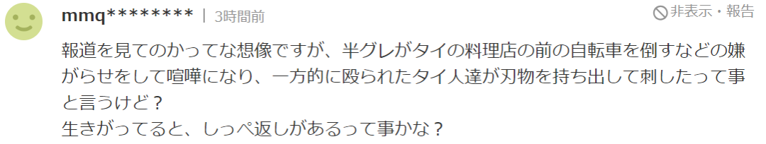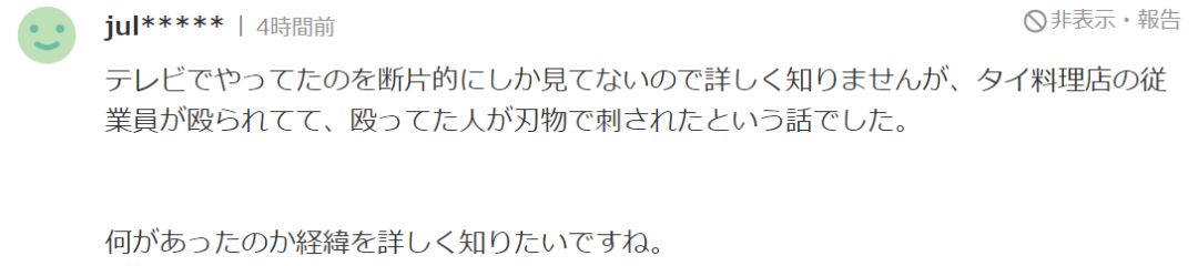 如果去看视频版的新闻就能大致明白,这事明明就是类似黑社会一样的日本人在泰国料理店门前闹事、然后被暴揍的泰国人怒火攻心、拿出刀捅人。