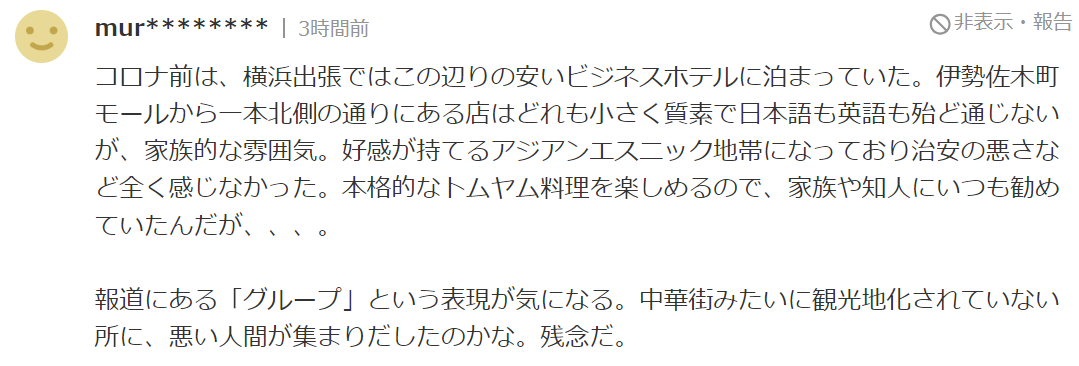 疫情之前,去横滨出差的时候,曾经在那个区域的一个比较便宜的商务酒店住过。从伊势佐木町购物中心往北走的街道上,有些小店,虽然简陋、店员的英语日语都不怎么样,但氛围感特别好,像家一样的温馨。对那一带完全没有治安差的感觉、反而觉得很喜欢。有非常正宗的冬阴功料理、我还经常推荐给家人和朋友······