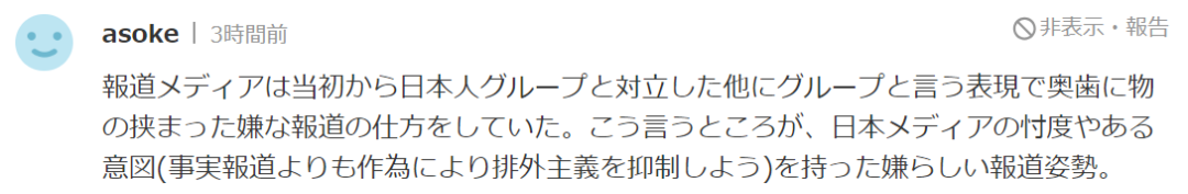 把重点放在“与日本人对立的团伙”去写,这样的报道真是令人恶心。媒体这种报道趋势(比起报道事实,他们更侧重表达抑制排外主义这个点)真是司马昭之心。