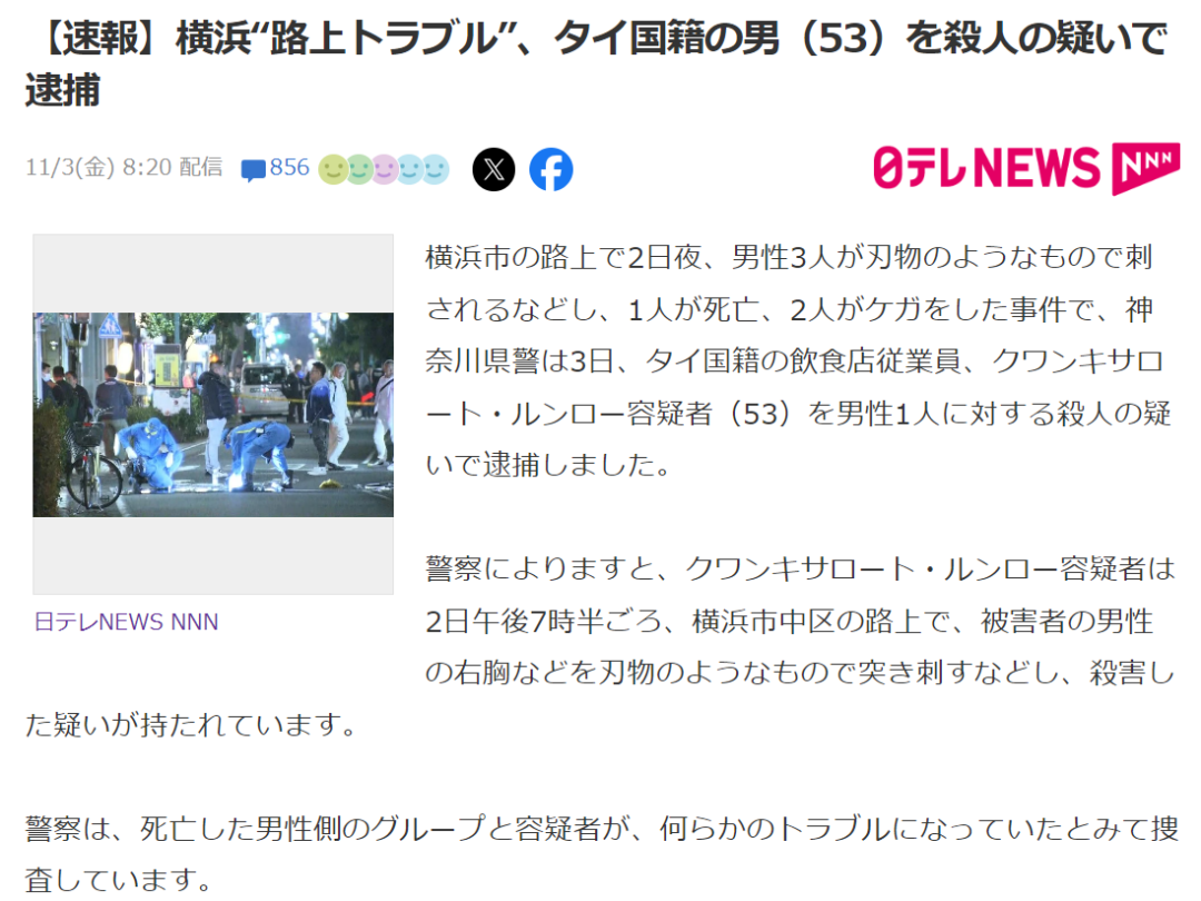 上图是来自日テレNEWS的文字版速报,公开时间为11月3日早8:20。速报标题:横滨“街边事故”、泰国籍男子(53岁)因杀人嫌疑被逮捕。