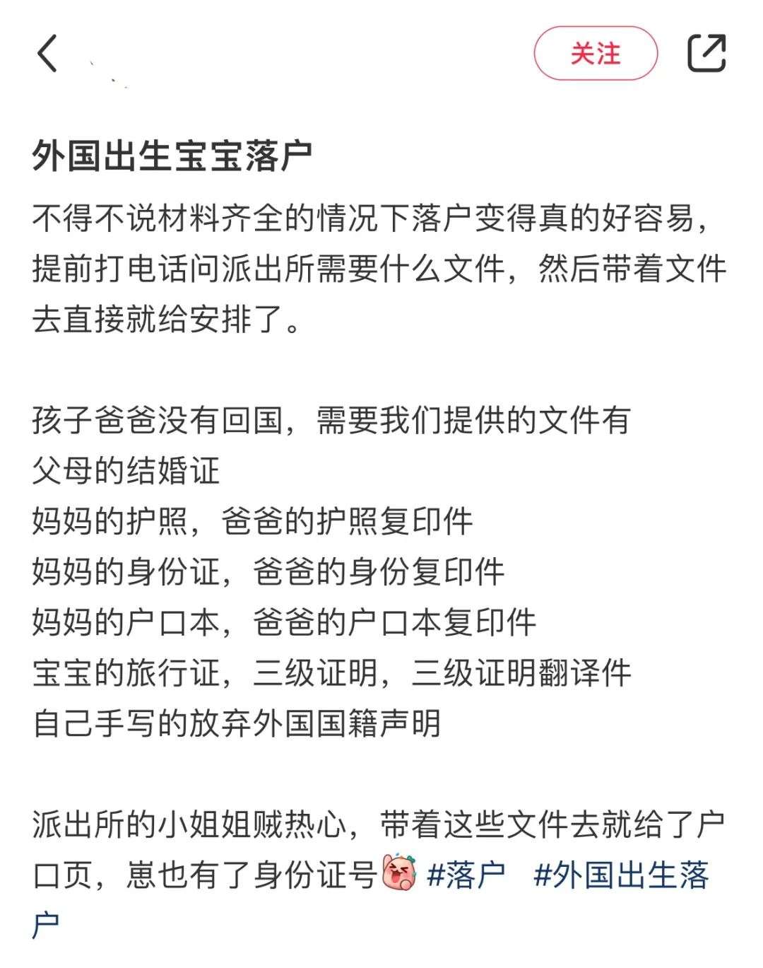 有宝妈说:“材料齐全的情况下,外国出生的宝宝落户中国变得容易了,提前打电话问派出所,准备好需要的文件就可以安排上了。”