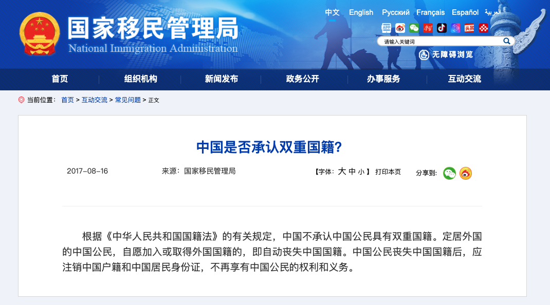 中国官方:不“承认”双国籍