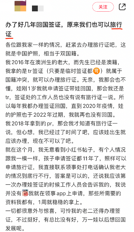 评论区有网友补充:“国籍冲突看孩子出生时状态,如果不主动退籍,办理旅行证的时间可能非常长。