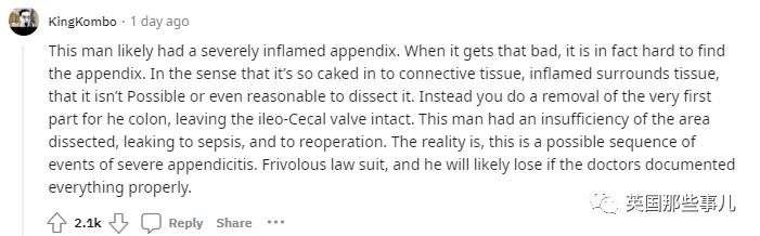 所以我猜现实情况应该是,这是一场严重阑尾炎导致的一系列并发症。如果医生正确记录了医疗过程的话,病人很可能会败诉的。