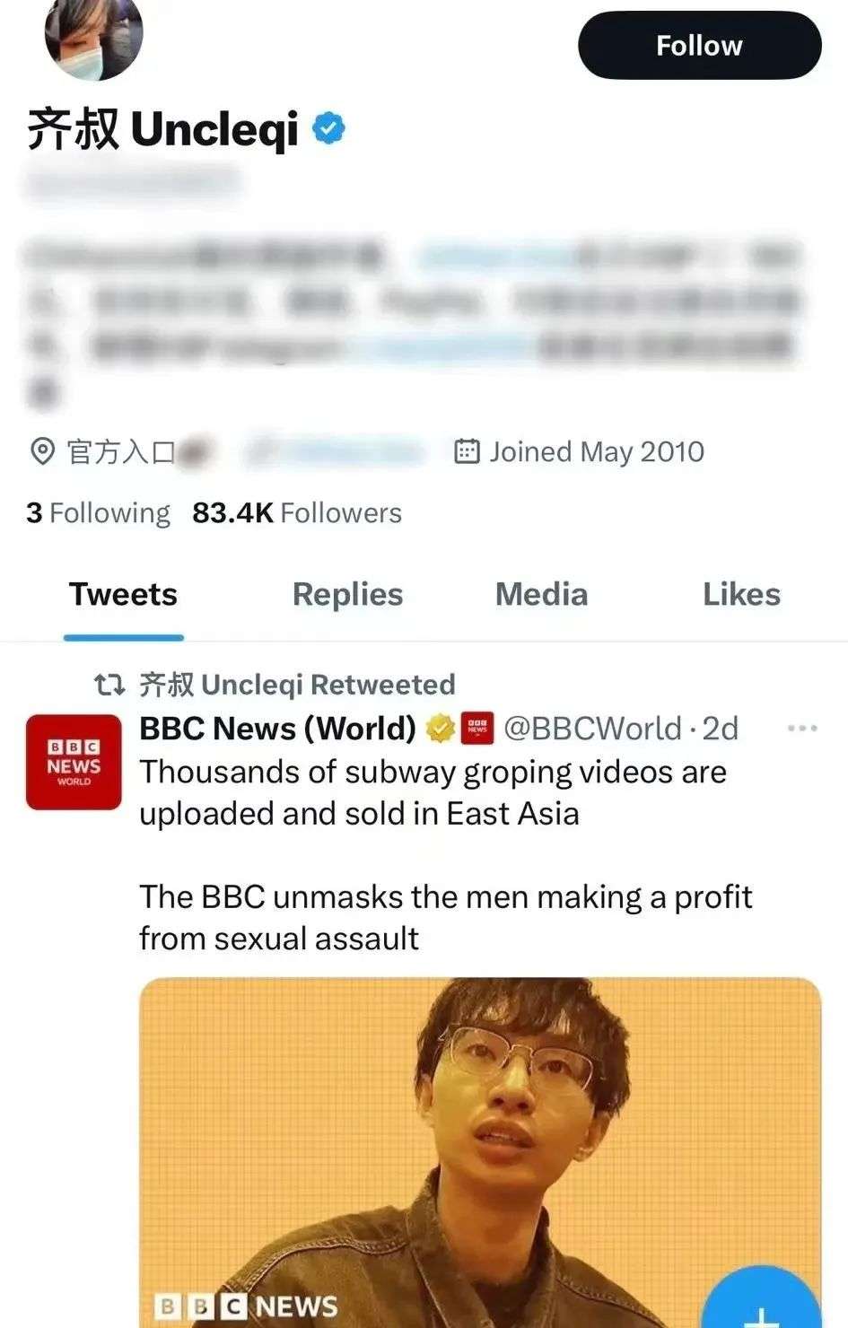 就拿之前已经被BBC曝光身份的“齐叔”来说,他在日本不仅没有承担任何法律后果,甚至还在社交主页挑衅似地转发了纪录片,当作他自己网站的免费广告。