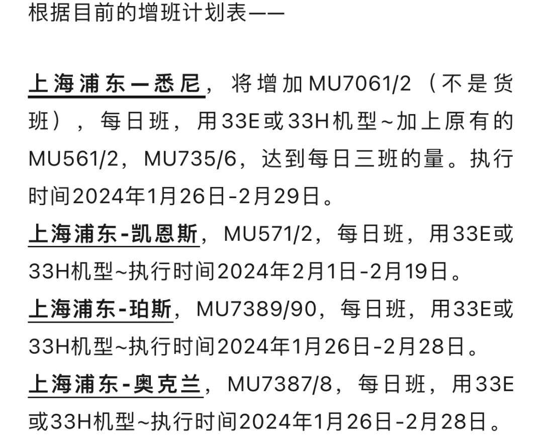 但是现在有小道消息(尚未发布官方公告):珀斯—上海春节航线可能要来了!,“上海浦东—珀斯航班将由MU7389/90,用33E或33H机型执飞。执行时间:2024年1月26日—2月28日。”