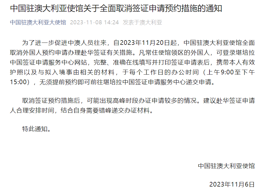 中国驻澳使馆也公布了全面取消签证申请预约措施的通知:为了进一步促进中澳人员往来,自2023年11月20日起,中国驻澳大利亚使馆全面取消外国人预约申请办理赴华签证有关措施。