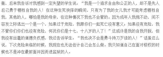 “我是一个追求自由和公正的人,却不是先人后己勇于牺牲自我的人!在这种生死抉择的瞬间,只有为了我的女儿我才可能考虑牺牲自我,其他的人,哪怕是我的母亲,在这种情况下我也不会管的。”