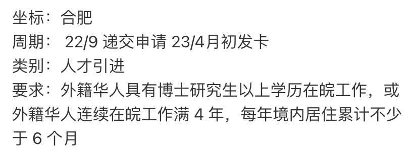 “外籍华人具有博士研究生以上学历在皖工作,或外籍华人连续在皖工作满4年,每年境内居住累计不少于6个月。”