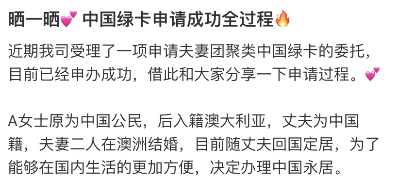 一位澳籍华人网友就成功帮娃拿到了中国绿卡,