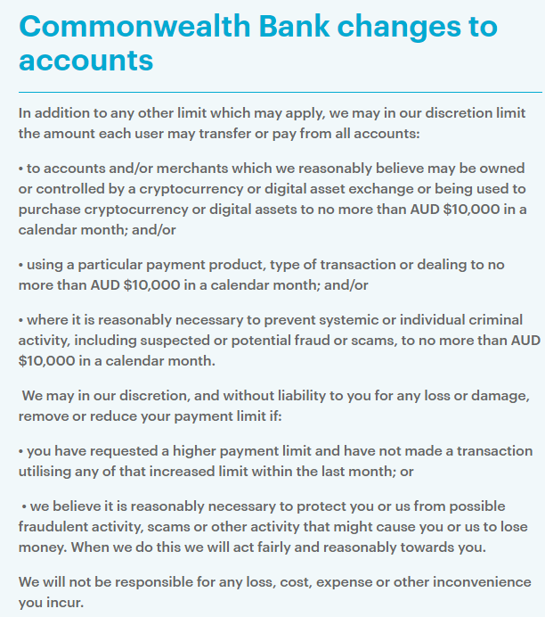 “我们可能会限制账户转账给部分账户或商家的金额,比如,如果你想转账给与加密货币交易相关的账户,那么你每个月的转账上限不得超过1万澳元。”