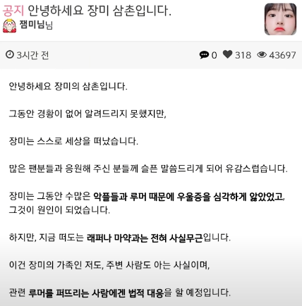 自杀原因最早要追溯到2019年7月8日,Jammi在游戏直播平台Twitch直播时做出了被称为“꼬카인”的的动作,被韩国网友指责是厌男。