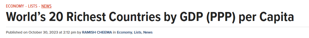 最近,财经网站Insider Monkey以各国2023年人均国内生产总额为基础,发布“全世界最富裕20国家(地区)”排行榜。