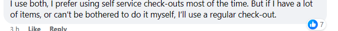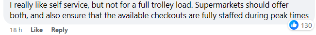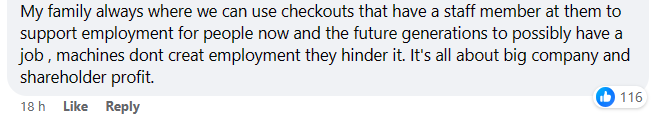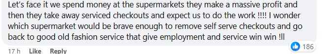 “让我们面对现实吧,我们在超市花钱,他们赚取巨额利润,然后他们取消人工结账,还指望我们自己来做这项工作!我想知道哪家超市有足够的勇气取消自助结账、并恢复良好的老式服务,让就业和服务双赢!”