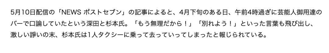 不过据日媒透露,杉本和深田分手可能还有一个隐藏原因,就是深田的精神状况。据说在他们交往期间,杉本曾多次被她吓到。