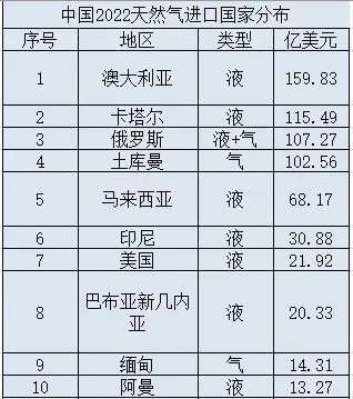 中国2022年天然气进口来源