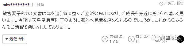 “爱子公主的文书越来越出色了,我很高兴能切身感受到您的成长。今后您能像天皇皇后那样去海外增长见识吗?期待您今后更加活跃的表现。”