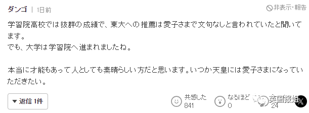“听说爱子公主在学习院高中成绩出众,如果是爱子公主被推荐到东大,大家完全没有意见,但她大学还是进了学习院。
