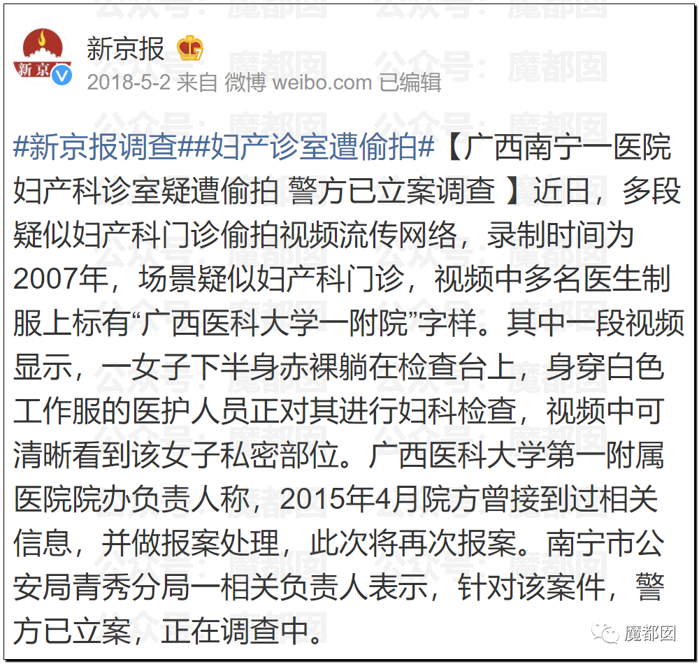 多段网络流传视频录制时间为2007年,场景疑似妇产科门诊,视频中多名医生制服上标有“广西医科大学一附院”字样。其中一段视频显示,一女子下半身赤裸躺在检查台上,身穿白色工作服的医护人员正对其进行妇科检查,视频中可清晰看到该女子私密部位。