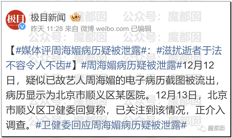 收藏恶臭!周海媚病历泄露!离世时惨状被公开!警方:为炫耀拍照发微信,已遭行拘