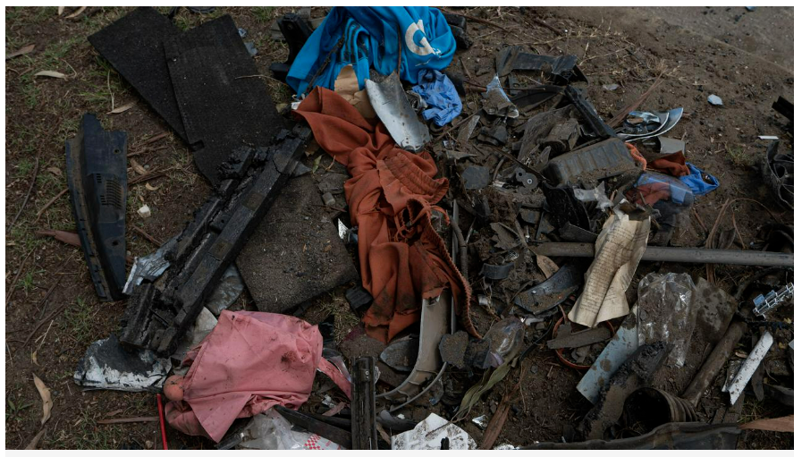 在车祸现场还残留着车辆撞击后留下的碎片,散落着一些衣物和其他小物件,还有一个绿色的塑料P牌...