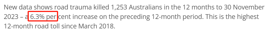 其中,新州死亡人数激增23.8%,道路死亡人数从286增加到354人;南澳报告了113人死亡,对比同期增长了61.4%。