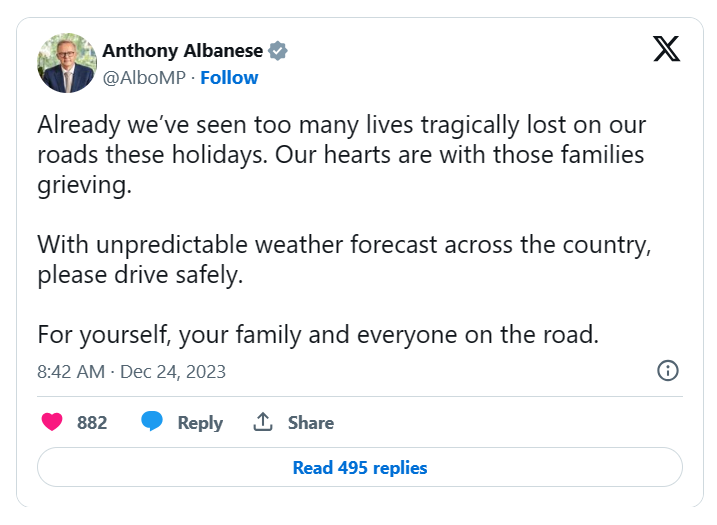 就连澳洲总理Anthony Albanese也在X(原推特)上恳请人们注意安全驾驶,
