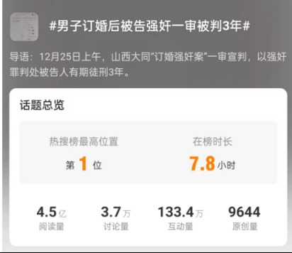 原本这个案件就充满了戏剧性,再加上某些媒体大肆渲染“订婚强奸”、“婚房”、“彩礼”这些全部踩在了网友的雷点和痛点上的字眼,于是一下子就爆了。